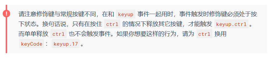 上述文档告诉我们,如果想释放ctrl就触发事件,我们可以使用keyup.17来替换keyup.ctrl