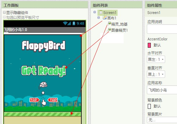 其中屏幕FlappyBird标题用“飞翔的小鸟v1.0”+“姓名” ;4个水管分别设置图片、取消可见性。