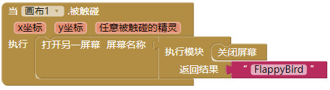(11)当小鸟被碰撞 时的代码。即是小鸟碰到水管或地面(精灵),则游戏结束,停止计时器,播放失败声音并显示得分。