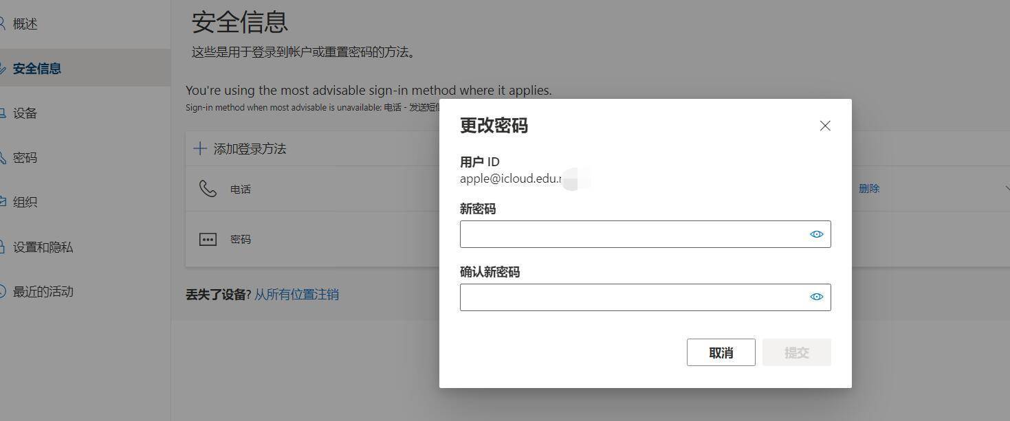 我们直接修改edu邮箱密码就可以,https://account.activedirectory.windowsazure.com/changepassword.aspx或者点击My Sign-Ins | Security Info | Microsoft.com都可以更改密码,添加密保是直接点击添加任意一个方法,忘记密码重置的时候可以自己找回。