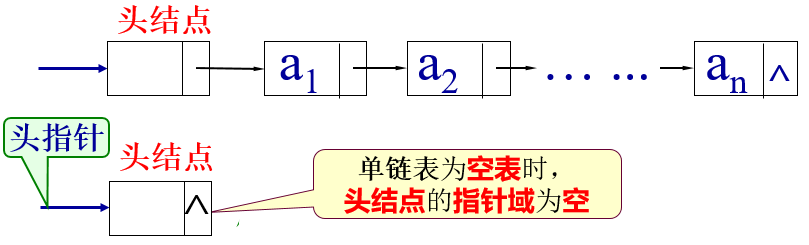 (2) 每个结点除了存储数据元素本身,还设置了一个指针域,存放后继结点的指针,以此表示每个数据元素与其直接后继数据元素之间的逻辑关系。