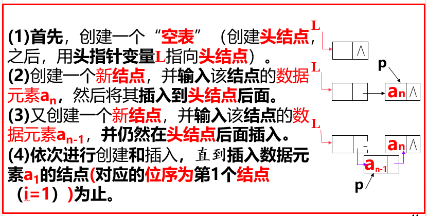 (1)必须先要找到单链表中第i-1个结点,此时第i-1个结点的指针域存放着第i个结点的地址。 (2)先需要将待插新结点的指针域存第i个结点地址以掌握后面的表。 (3)再修改第i-1个结点的指针域使其存要插入的新结点的地址,完成插入。