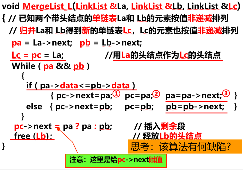 初始条件:顺序表La 和Lb中数据元素必须均按值非递减有序排列 操作结果:归并La 和Lb得到顺序表Lc,使Lc中的数据元素也按值非递减有序排列