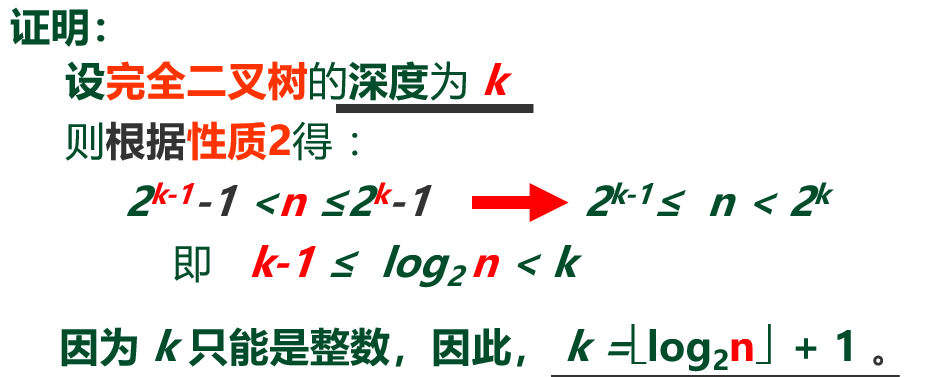 具有 n 个结点的完全二叉树的深度 k = \left \lfloor log_2n \right \rfloor +1