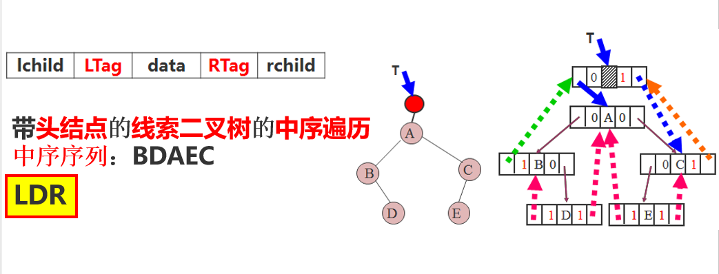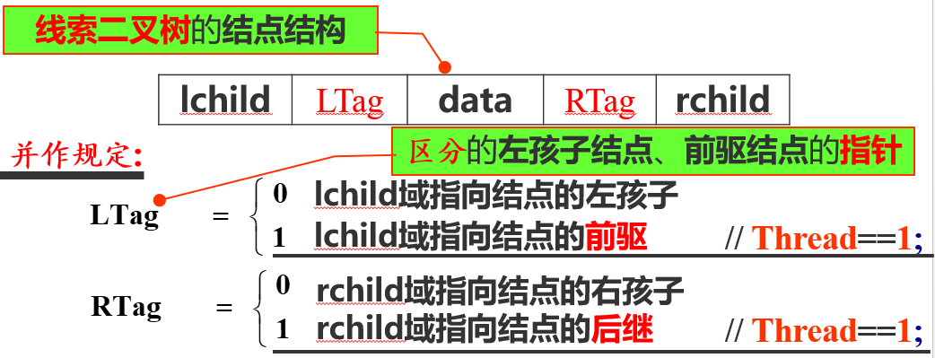 1 typedef enum { Link, Thread } PointerTag ;// Link==0; Thread==1; 2 typedef struct BiThrNode{ 3 TElemType data; 4 struct BiThrNode *lchild, *rchild; 5 PointerTag LTag, RTag; // 左、右标志 6 } BiThrNode, *BiThrTree;