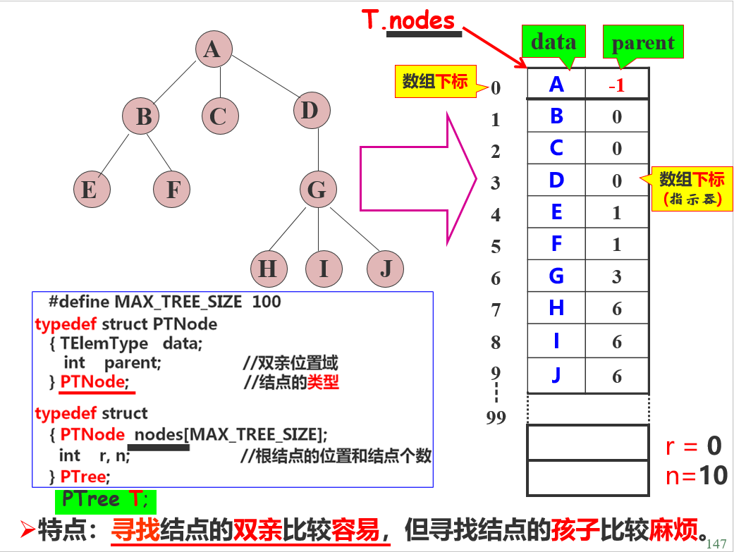 以一组地址连续的存储单元存储树的所有结点, 在每个结点中设一个指示器指示其双亲结点在表中的位置