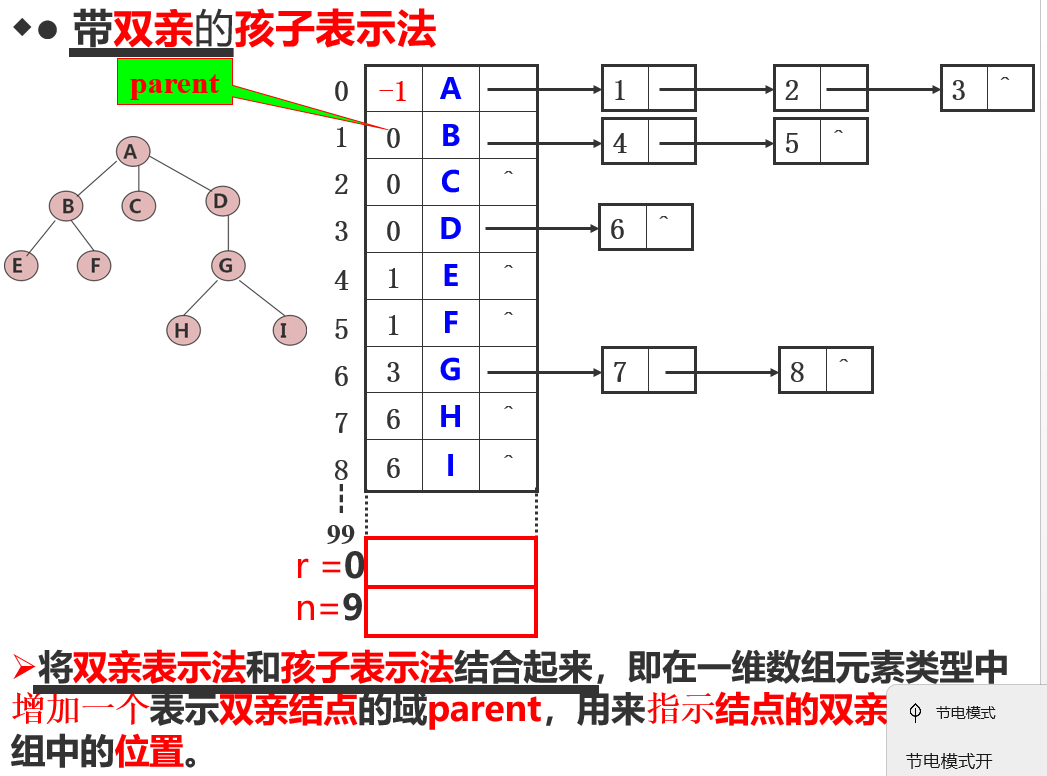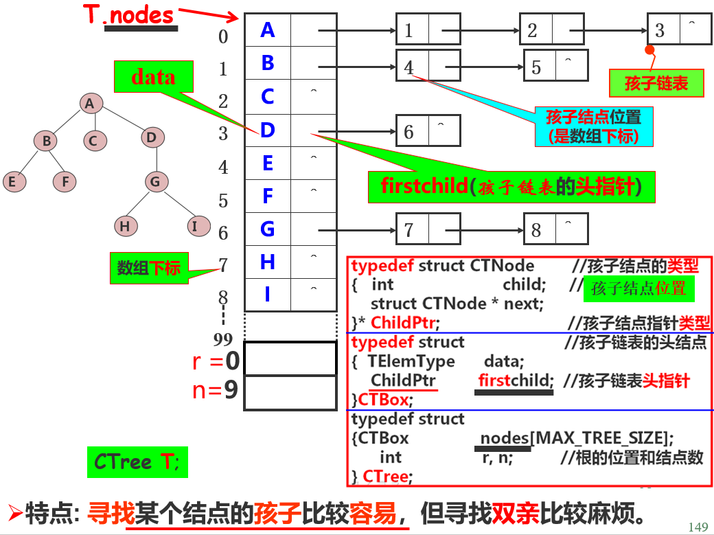 把每一个结点的孩子结点排列起来, 构成一个单链表。n个结点有n个孩子链表(叶子结点的孩子链表为空表)。并将n个结点的数据和n个孩子链表的头指针组成一个顺序表