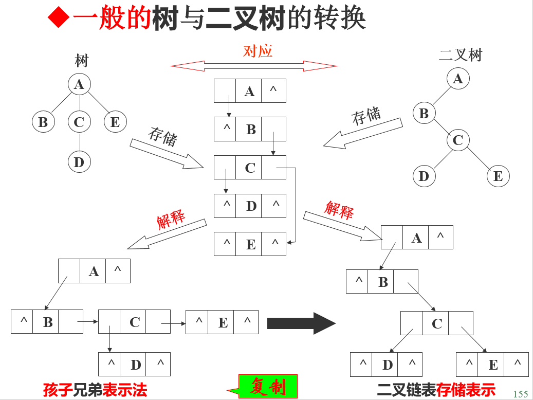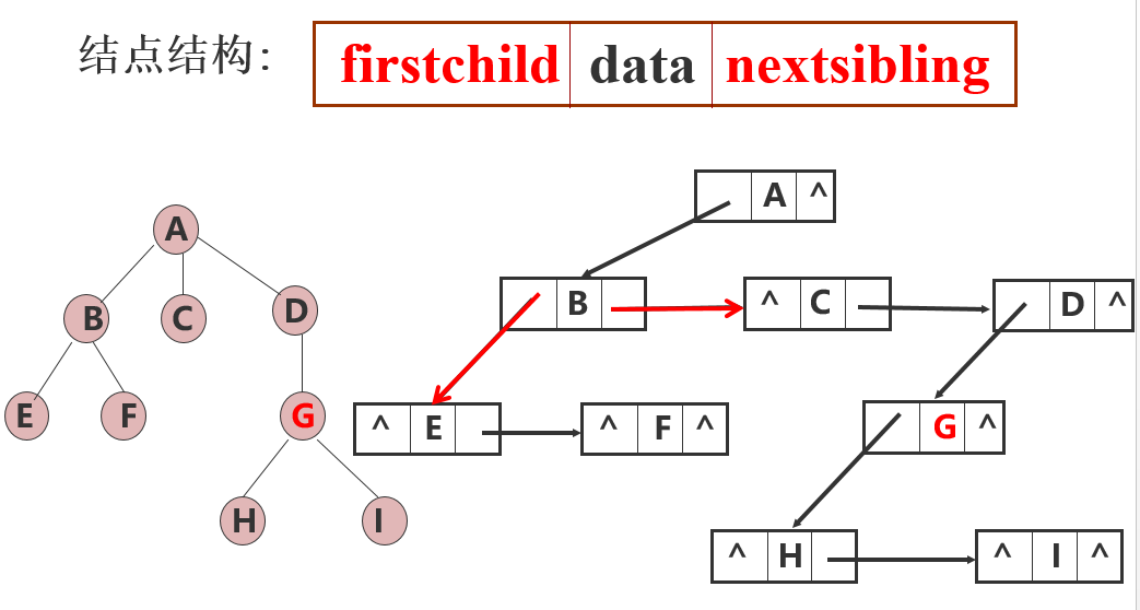 该方法仍然采用二叉链表作为树的存储结构,但是二叉链表中结点的两个指针域分别指向该结点的第一个孩子结点和指向该结点的右边第一个兄弟结点