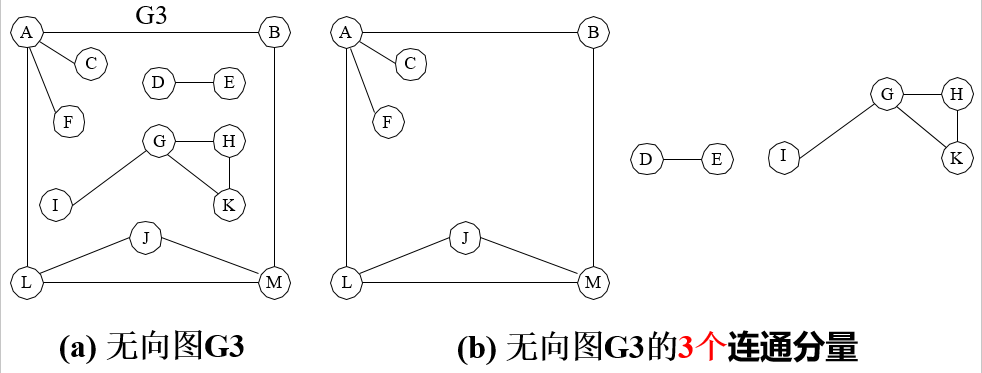 若无向图为非连通图, 则图中各个极大连通子图称作此图的连通分量。非连通的无向图有多个连通分量