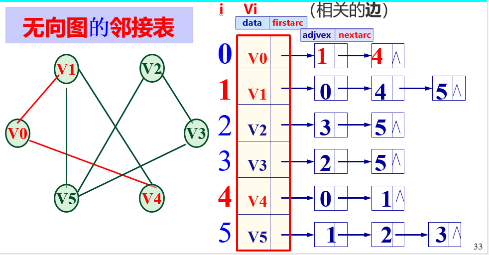 先构建一个无向图的顶点结点的一维数组(顺序表),之后对无向图中的每个顶点结点(单链表头结点)建立一个单链表,第i个单链表中的结点用于表示与顶点V_i(单链表头结点)相关联的边