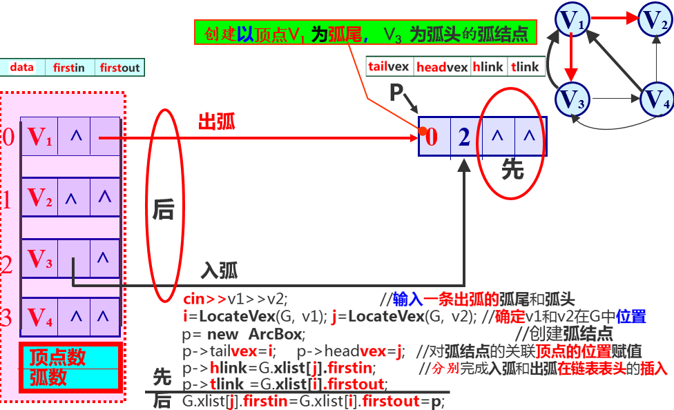 1 Status CreateDG( OLGraph &G ) 2 { //采用十字链表存储表示,构造有向图G(G.kind=DG)。 3 int IncInfo; ArcBox * p; VertexType v1, v2; 4 cin>>G.vexnum>>G.arcnum>>IncInfo ; // IncInfo为0则各弧不含其他信息 5 for(i=0; i<G.vexnum; ++i) //构造表头向量 6 { cin>>G.xlist[i].data; //输入各个顶点名字字符串 7 G.xlist[i].firstin=NULL; 8 G.xlist[i].firstout=NULL; //初始化指针 9 } 10 ---------------------------------------------------------------- 11 for(k=0; k<G.arcnum; ++k) //输入各条出弧,并构造十字链表 12 { cin>>v1>>v2; //输入一条出弧的弧尾和弧头 13 i=LocateVex(G, v1); j=LocateVex(G, v2); //确定v1和v2在G中位置 14 p= new ArcBox;//创建弧结点 15 p->tailvex=i; p->headvex=j; //对弧结点的关联顶点的位置赋值 16 p->hlink=G.xlist[j].firstin; //分别完成入弧和出弧在链表表头的插入 17 p->tlink =G.xlist[i].firstout; 18 G.xlist[j].firstin=G.xlist[i].firstout=p; 19 if(IncInfo) Input(*p->info); //若弧含有相关信息,则输入 20 } 21 return OK; 22 }