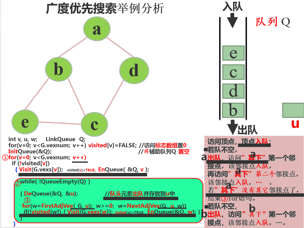 1 void BFSTraverse(MGraph G, Status(*Visit)(VertexType)) 2 { //初始条件: 图G存在, Visit是指向函数的指针变量。 3 //操作结果: 从第1个顶点起,按广度优先非递归遍历图G,并对每个顶点调用函数 4 //Visit一次且仅一次。一旦Visit()失败, 则操作失败。 5 //使用辅助队列Q 和 访问标志数组visited 6 int v, u, w; LinkQueue Q; 7 for(v=0; v<G.vexnum; v++) visited[v]=FALSE; //访问标志数组置0 8 InitQueue(&Q); //将辅助队列Q 置空 9 for(v=0; v<G.vexnum; v++) 10 if (!visited[v]) 11 { Visit(G.vexs[v]); visited[v]=TRUE; EnQueue( &Q, v ); 12 ----------------- 13 while( !QueueEmpty(Q) ) 14 15 { DeQueue(&Q, &u); //队头元素出队并存放到u中 16 17 for(w=FirstAdjVex( G, u); w>=0; w=NextAdjVex(G, u, w)) 18 if(!visited[w]) { Visit(G.vexs[w]); visited[w]=TRUE; EnQueue(&Q, w); } 19 } 20 ------------------ 21 } 22 }