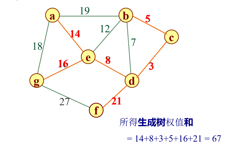 然后从权值最小的边开始,在{E}中选取权值最小的边,若它的添加不使ST中产生回路,则在 ST上加上这条边,如此重复,直至加上 n-1 条边(此时ST中所有顶点都在同一连通分量上)为止