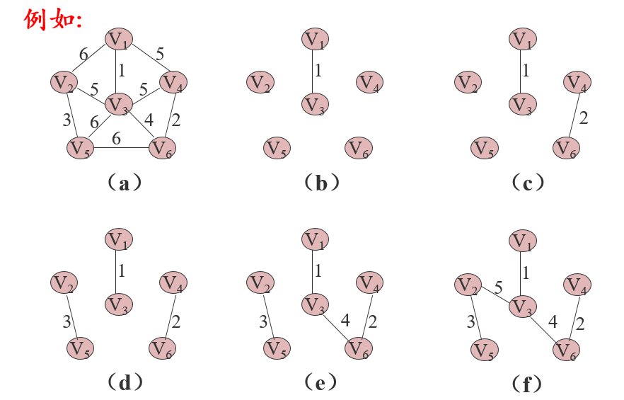 首先构造一个初始状态为只含n个顶点而无边的非连通图ST=(V,{ }), ST中每个顶点自成一个连通分量