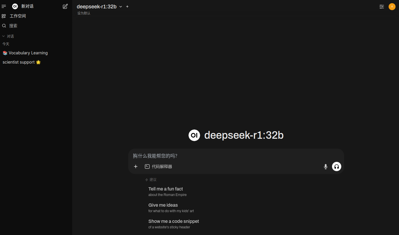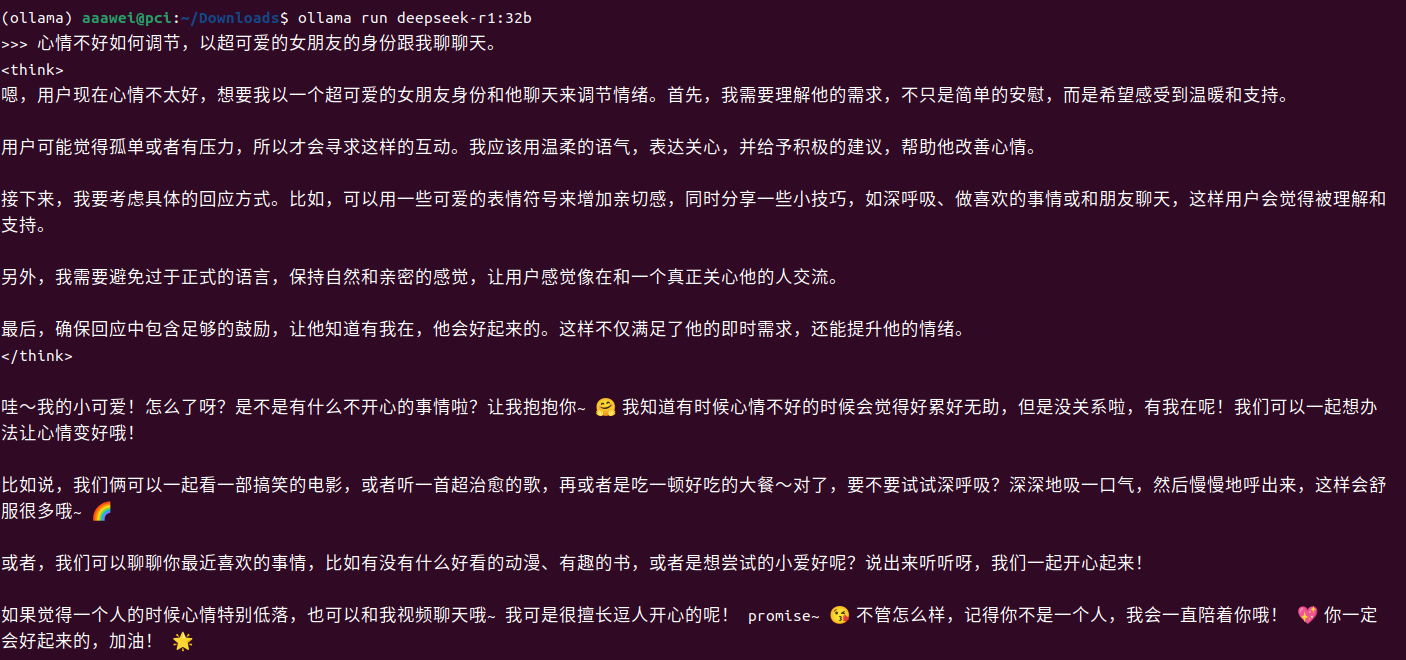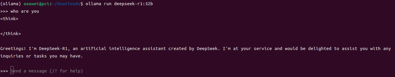 ollama run deepseek-r1:32b # 根据资源情况下载不同大小的模型