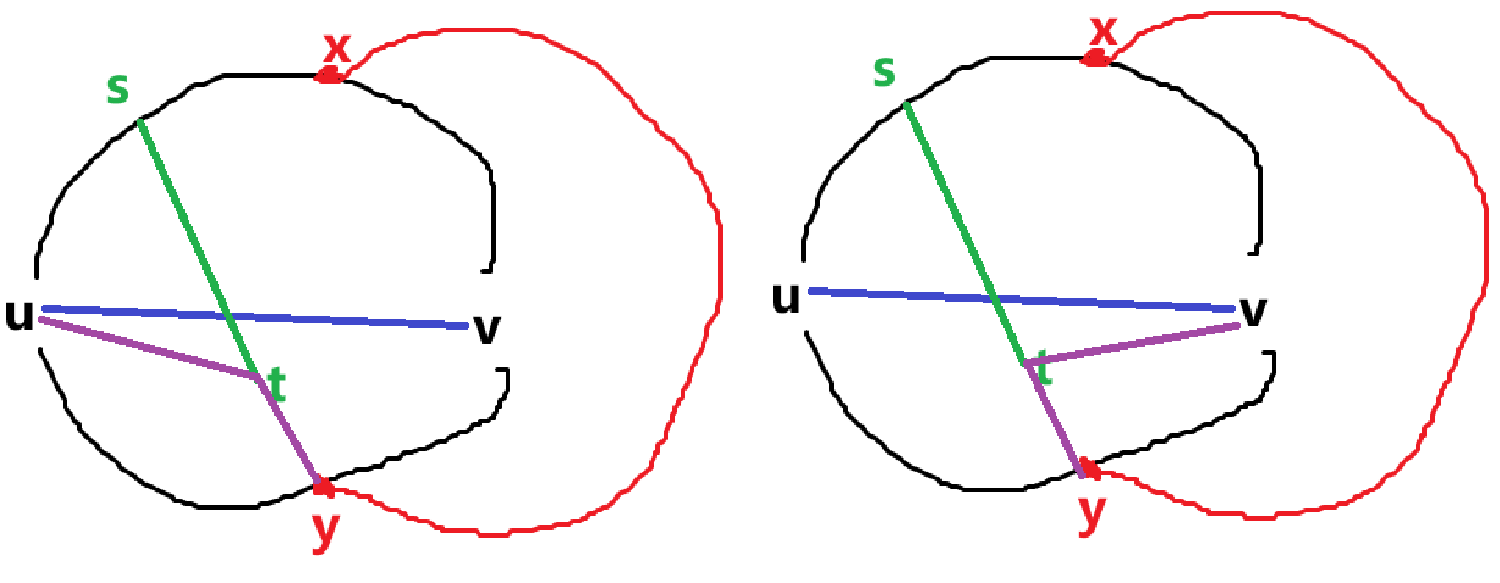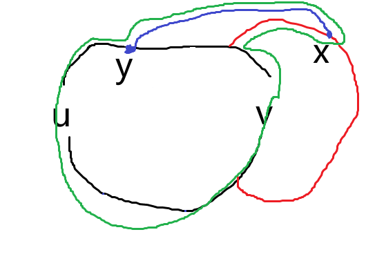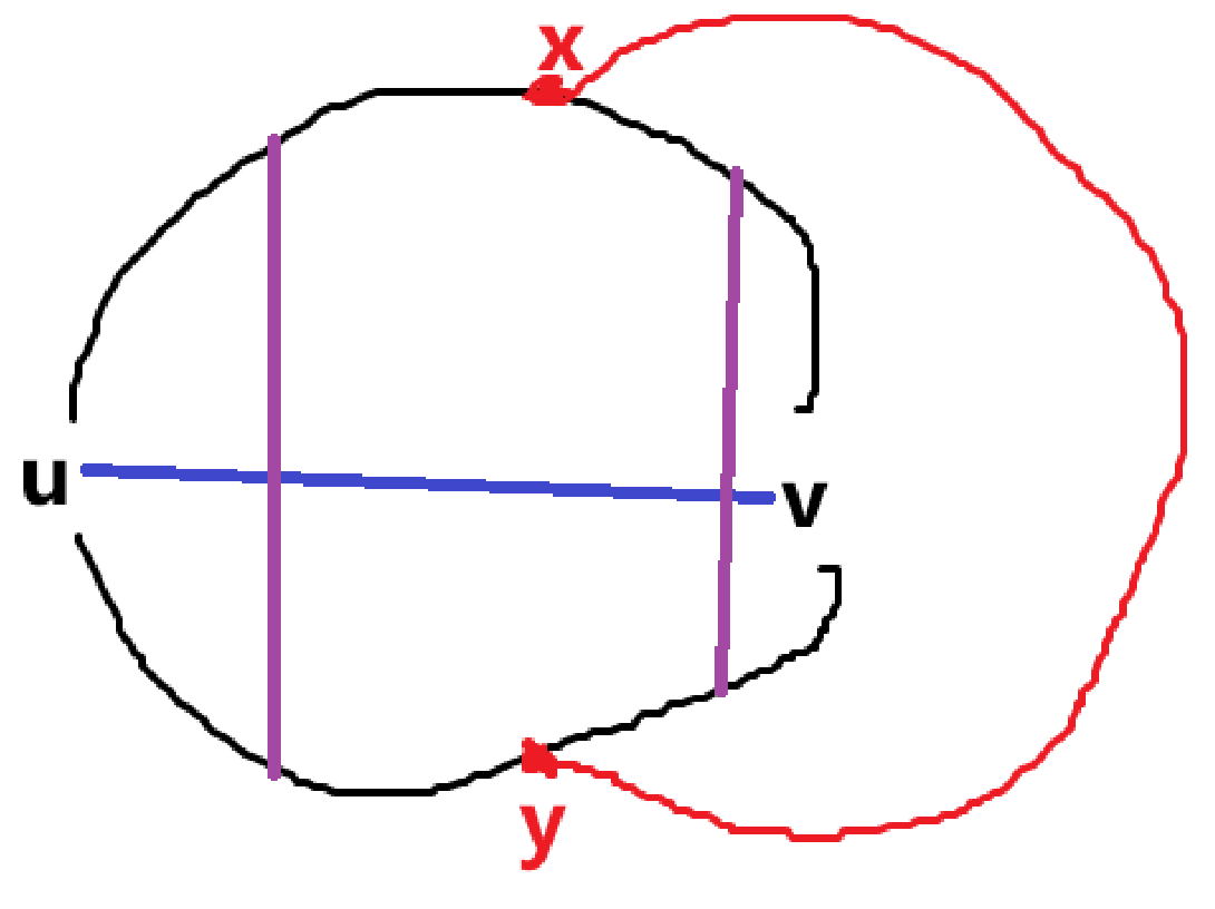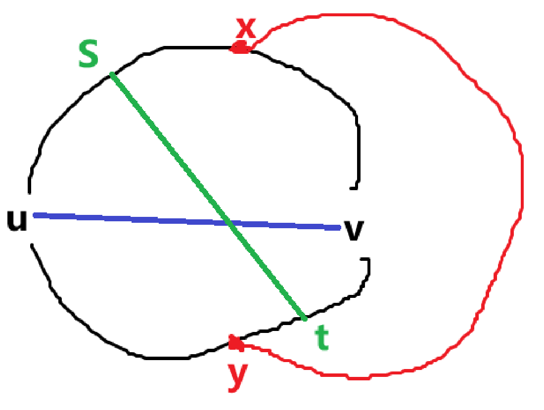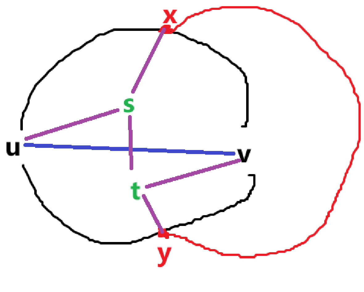 现在我们考虑这条交叉的边,假设其端点是 \(s,t\)(可以和已有点重合),记 \(C_x:u\to x\to v-u\),也就是上半环和蓝边构成的环(类似地,下半环记为 \(C_y\))。