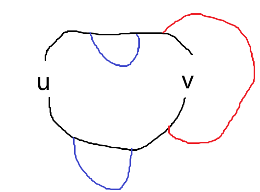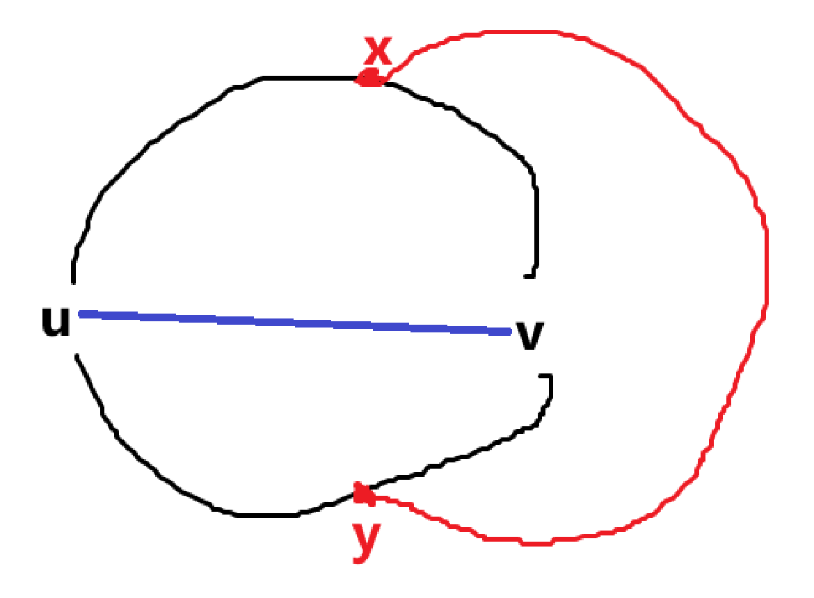 现在我们知道加入 \(u-v\) 这条边之后图就不可平面了,也就是我们不能在 \(C\) 内部把 \(u-v\) 连起来(外面显然已经不行了),也就是下图蓝边一定会和一条已经有的边交叉。