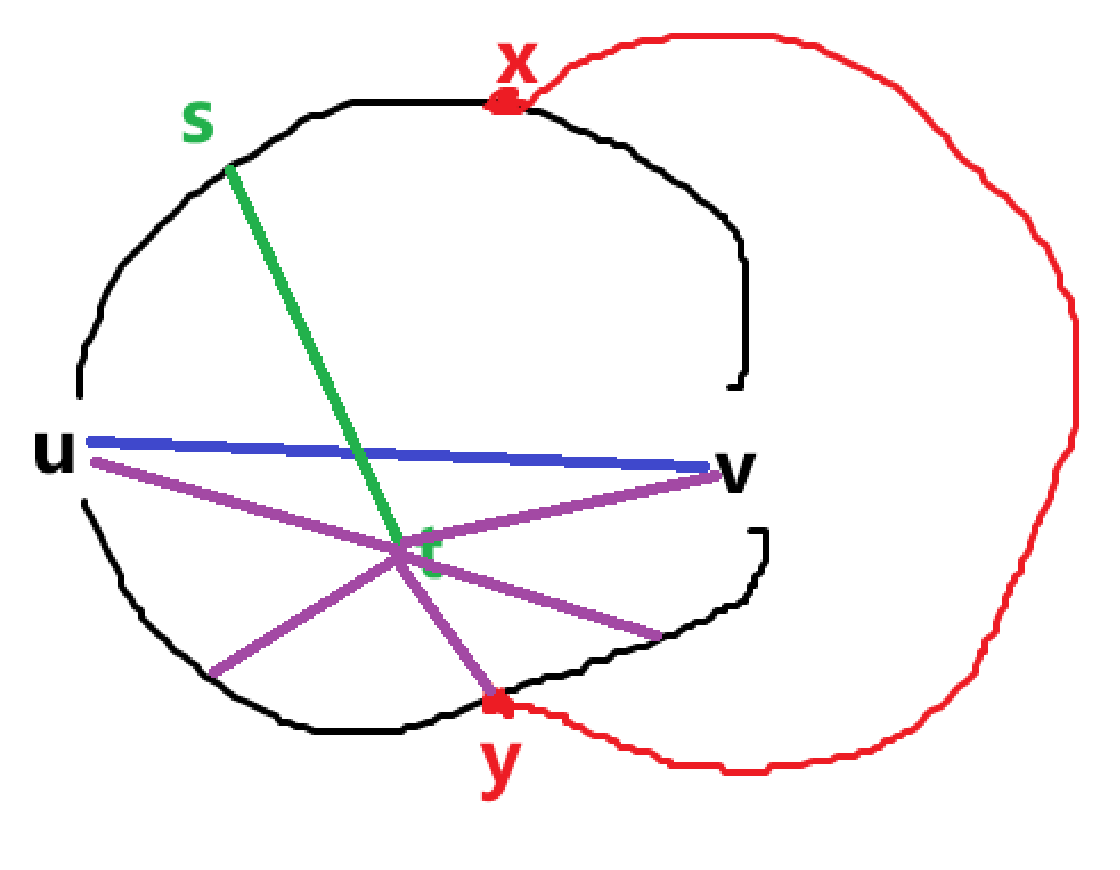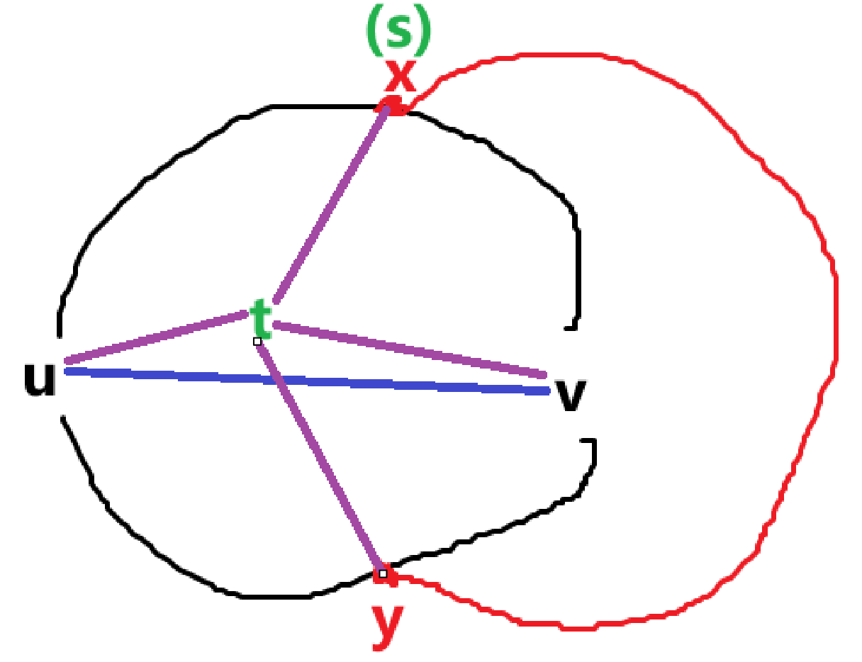 根据对称性,可以设 \(s\in u\to x\),因为首先 \(C_x\) 和 \(C_y\) 是对称的,我们可以把 \(s\) 放到 \(C_x\) 上,然后红边其实可以从右边穿过,也可以从左边穿过,所以 \(u\to x\) 和 \(v\to x\) 也是对称的。并且显然的,\(s\ne u\land s\ne v\)。