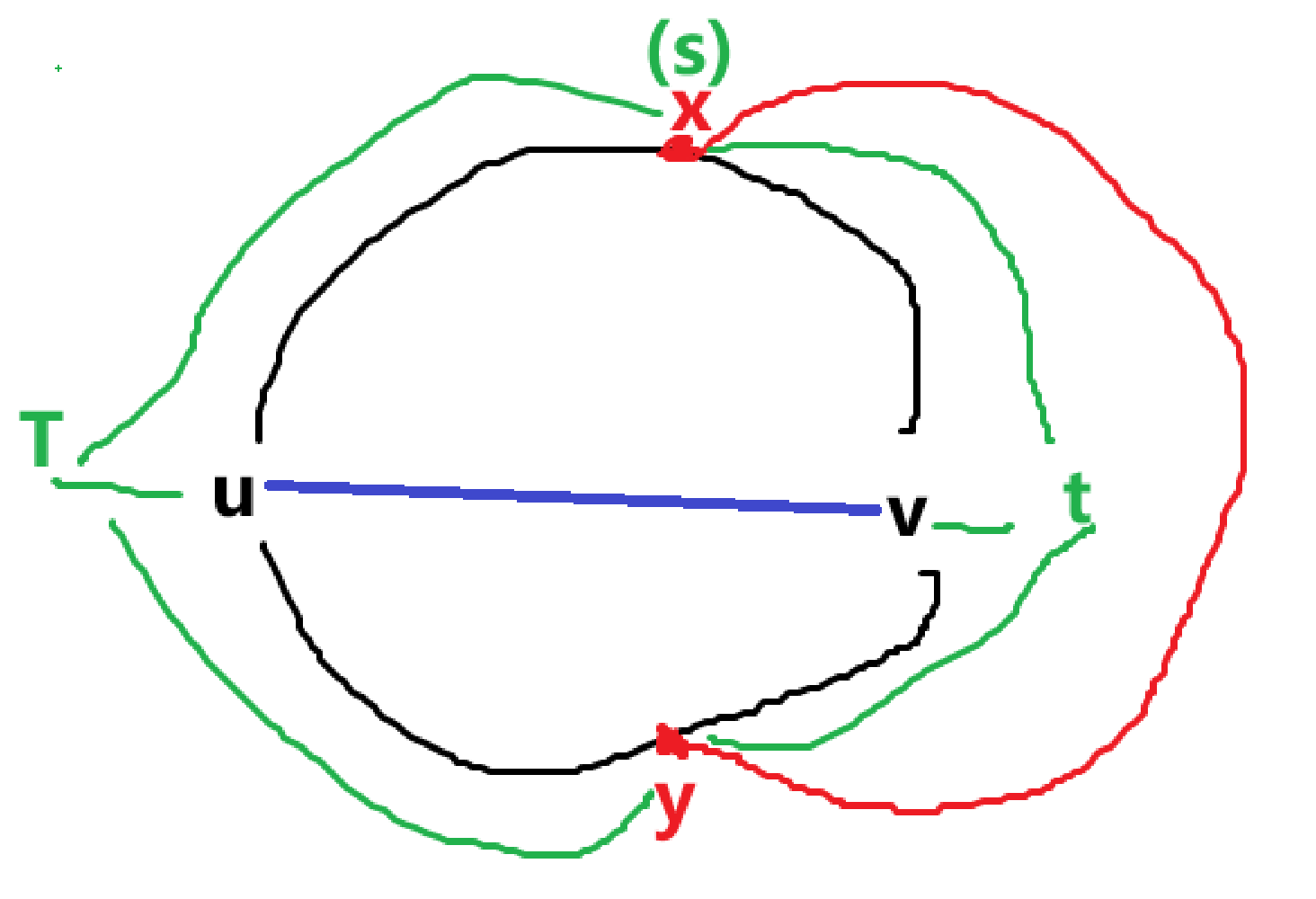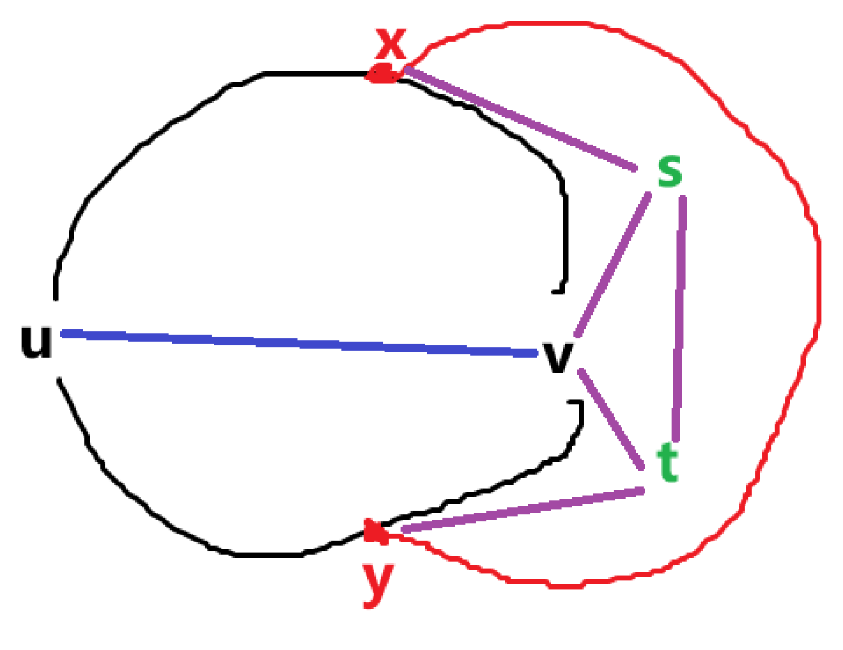 然后可以想到,\(s,t\) 不一定要在环 \(C\) 上,而是可以在已经有的边上。根据 \(\text{Lemma }2\),这里已经有的边是不包括 \(x\to y\) 的(图中红边)。