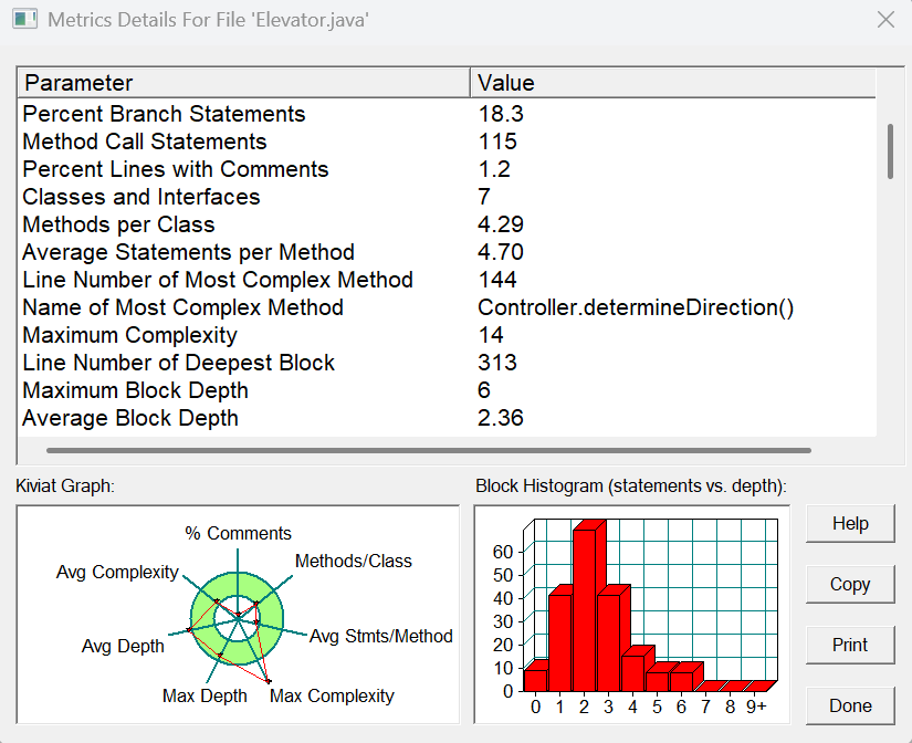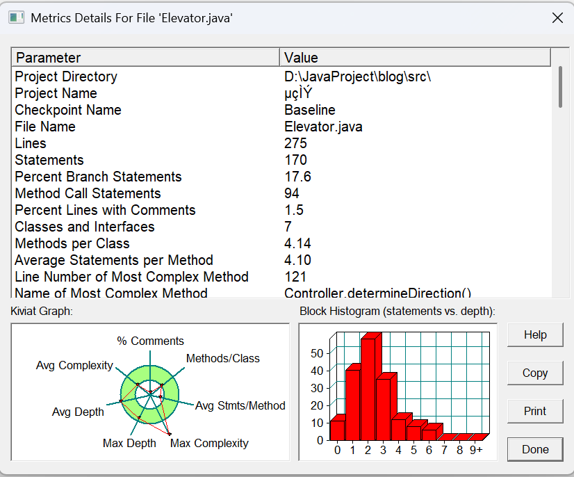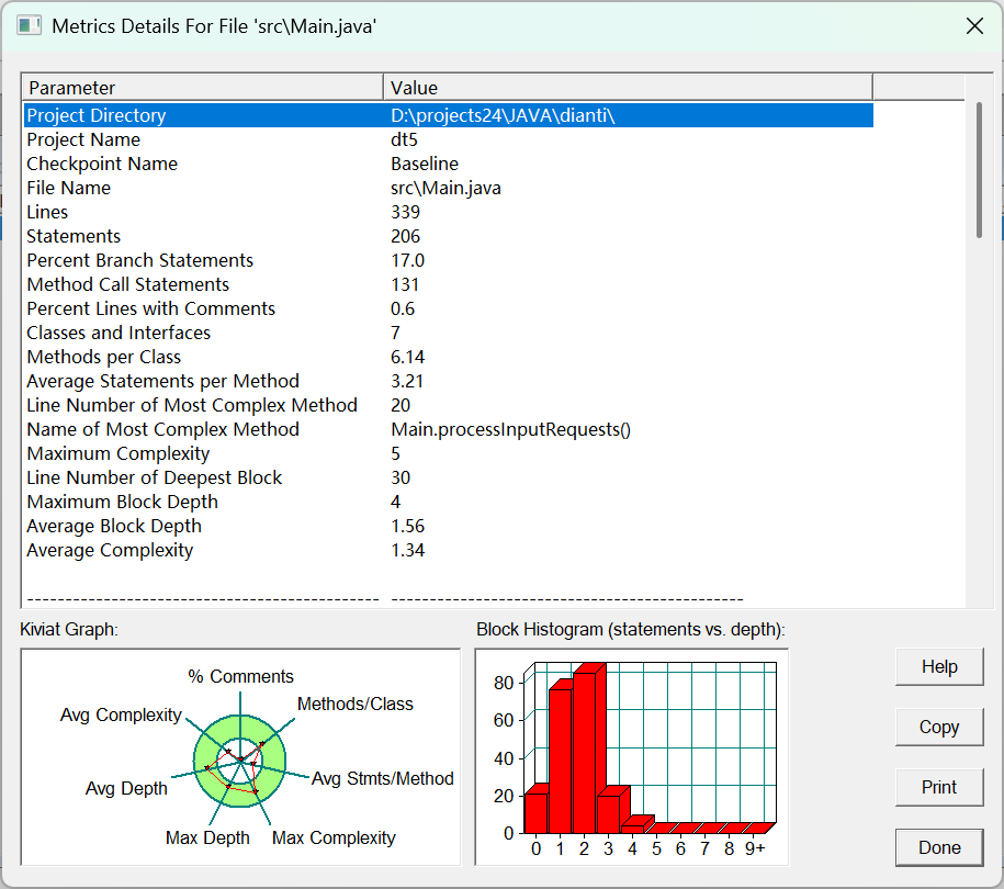 代码行数 275 语句数 170 分支语句占比 17.6% 方法调用语句数 94 含注释的代码行占比 1.5% 类和接口数 7 每类方法数 4.14 每方法平均语句数 4.10 最复杂方法的行号 121 最复杂方法的名称 Controller.determineDirection() 最大复杂度 14 最深代码块的行号 256 最大代码块深度 6 平均代码块深度 2.26 平均复杂度 2.24