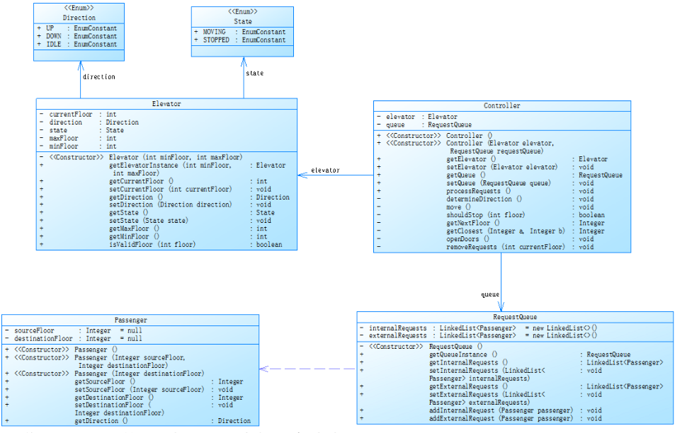 Direction 和 State 枚举类:定义电梯的方向(UP,DOWN)和状态(MOVING,STOPPED)