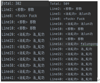 当屏蔽字为中文的时候,当文章也为中文相同的字时和英文的情况相同。当文章为拼音时将关键字转化为拼音进行比较,同音字部分和偏旁部分没有实现。