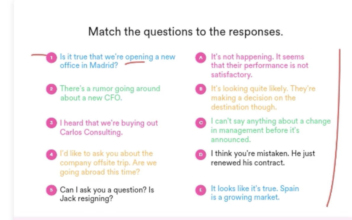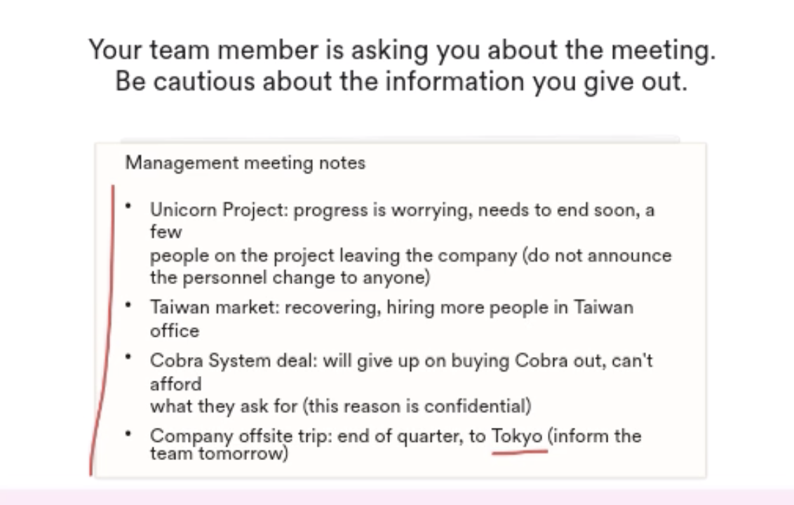 A: The second question:Your team member is asking you about the meeting.Be cautious about the information you give out.