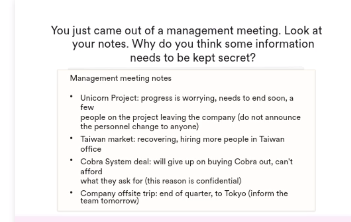 A:first questions,You just came out of a management meeting.Look at your notes.Why do you think some information needs to be kept secret?Read all thost point to me.
