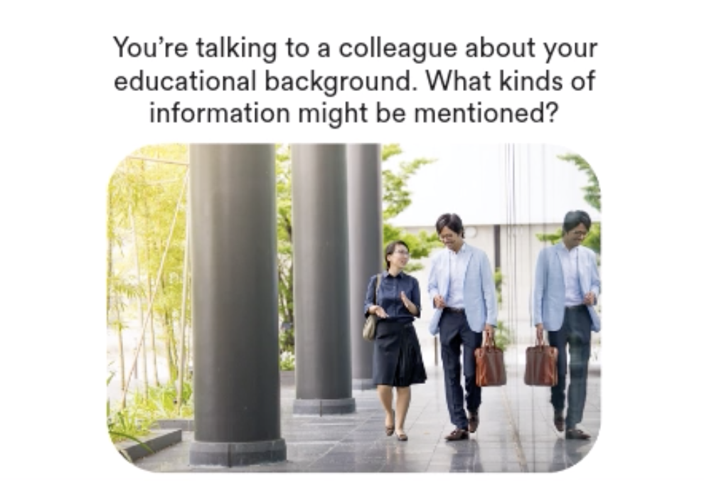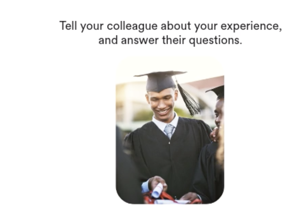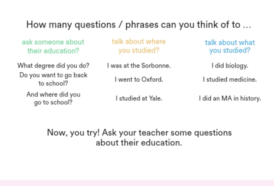 A: Tell your colleague about your experience, and answer their quesions.I will ask you,where University did you go to?