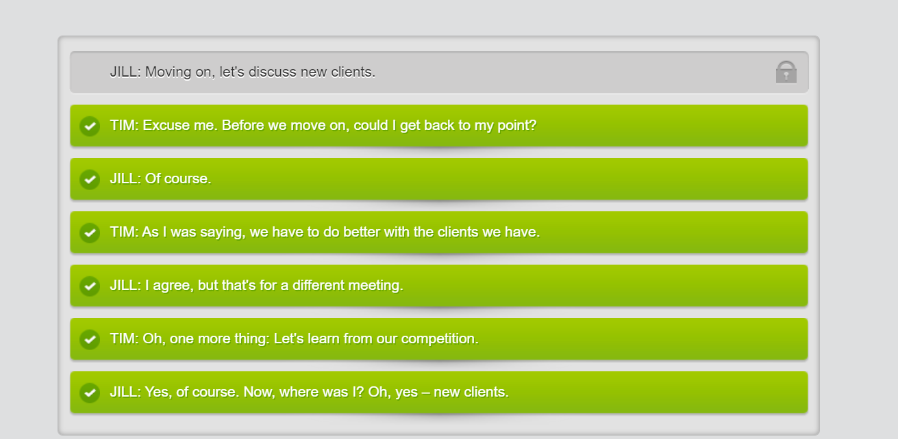 Talk about next steps, discuss confidentiality, and then close the meeting. Listen and record the correct response.