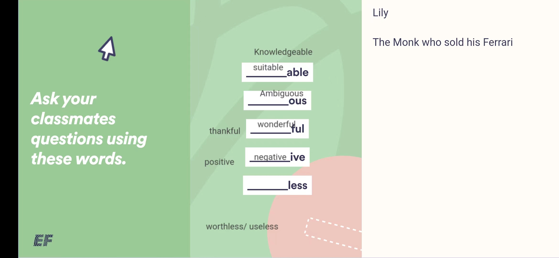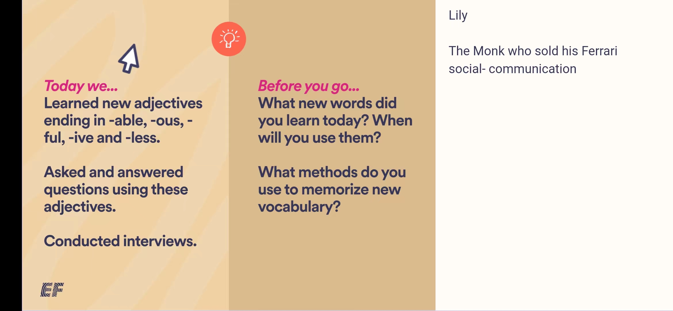 Learned new adjectives ending in -able,-ous,-ful,-ive and -less.