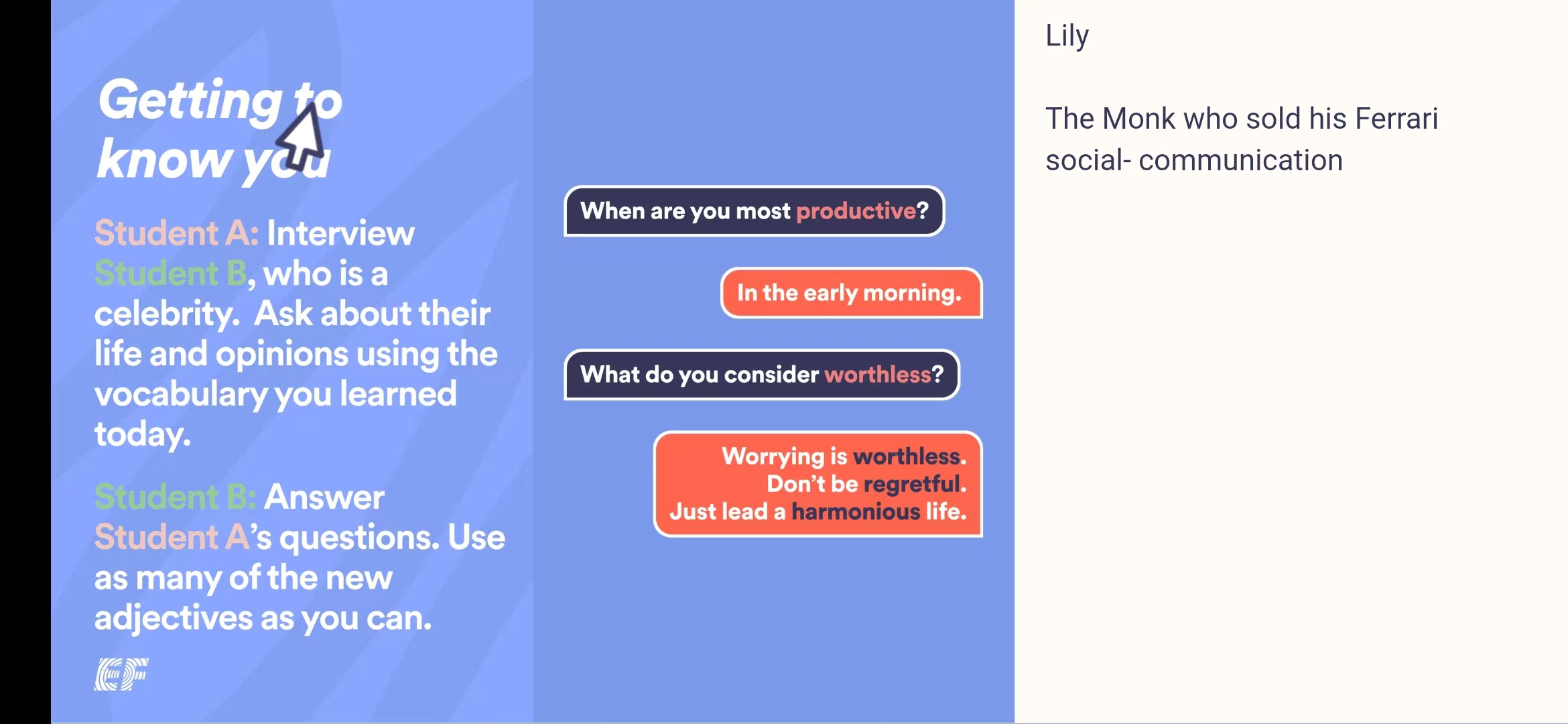 Student A:Interview Student B,who is a celebrity.Ask about their life and opinion using the vocabulary you learned today.