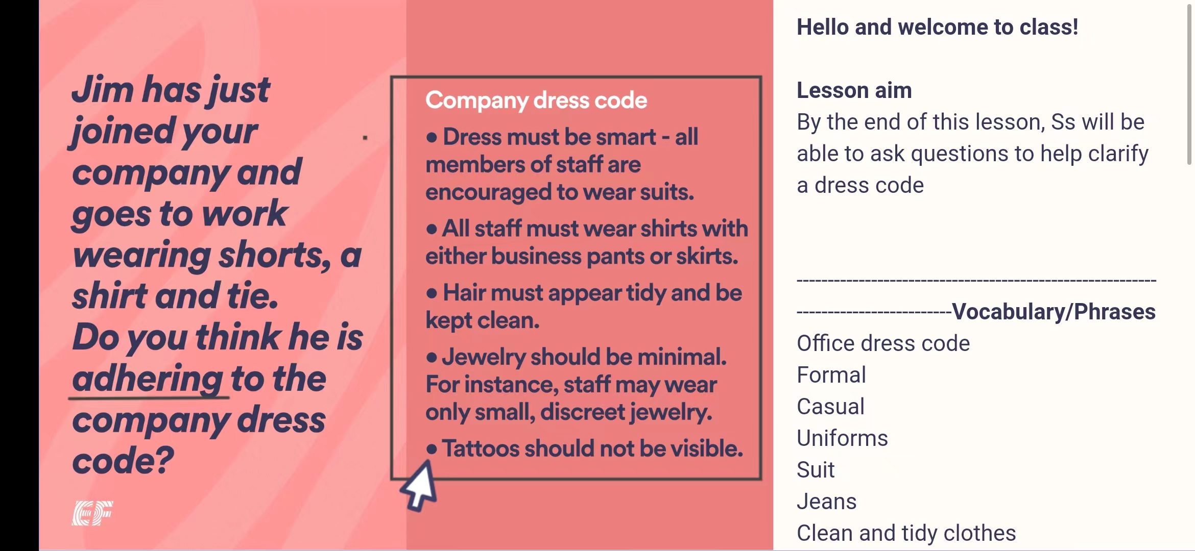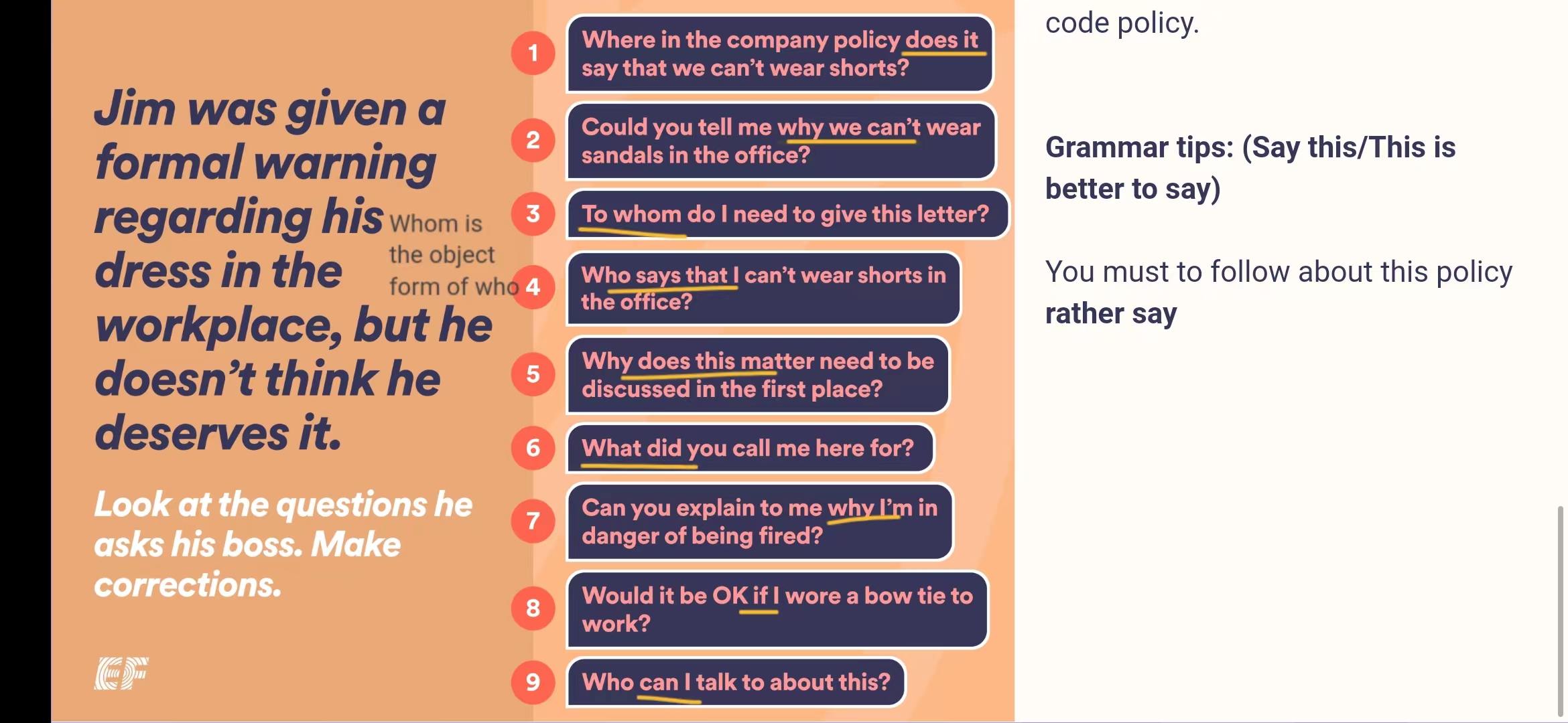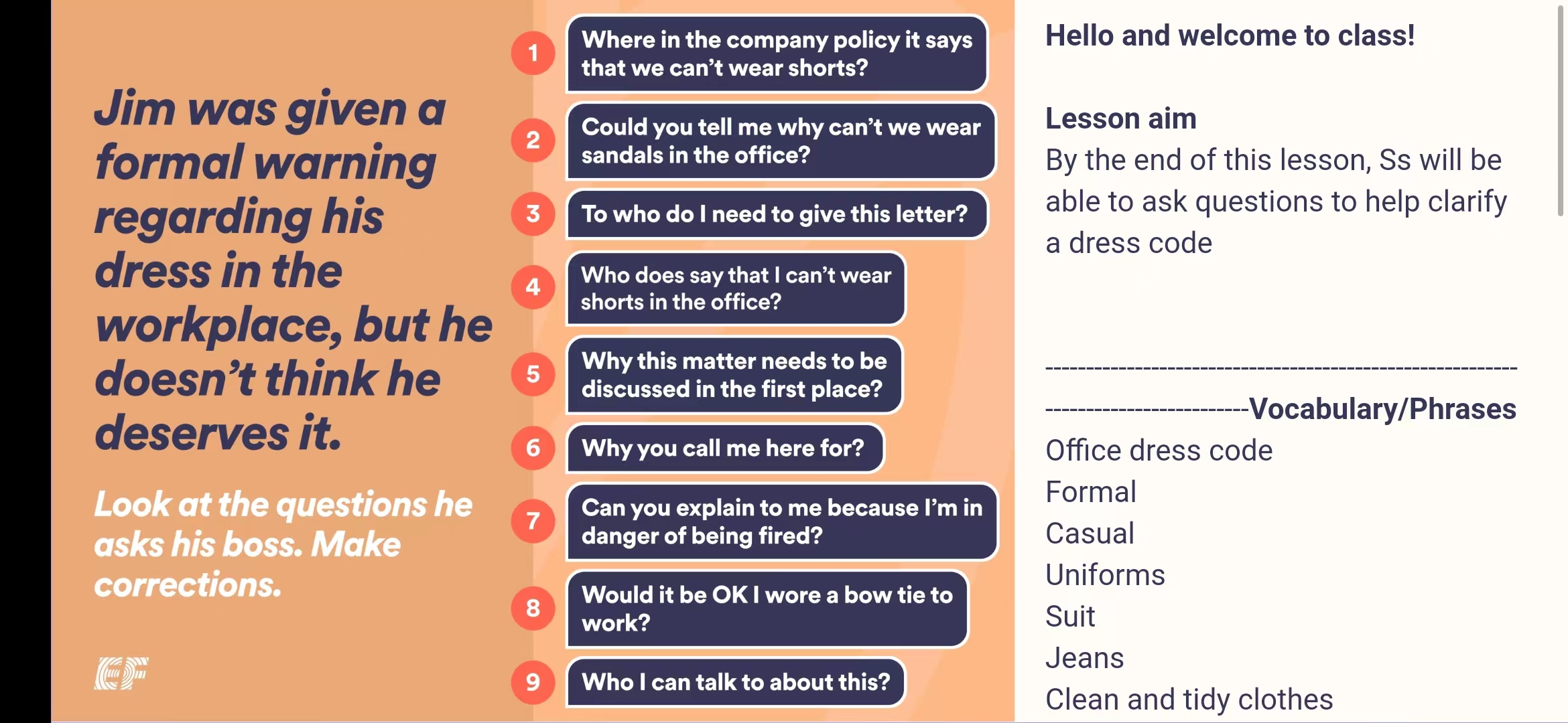 Jim was given a formal warning regarding his dress in the workplace,but he doesn't think he deserves it.