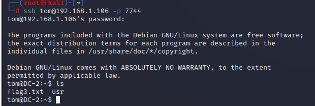 根据开头做的信息收集,可得知ssh端口为7744,进行登录,登陆成功