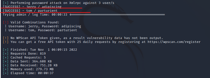 使用wpscan工具调用刚刚保存的用户名字典,密码字典对网站进行爆破。
