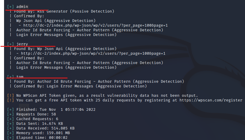 由于目前只有密码字典,所以还需要使用wpscan工具来枚举网站中注册过的用户名,来制作用户名字典
