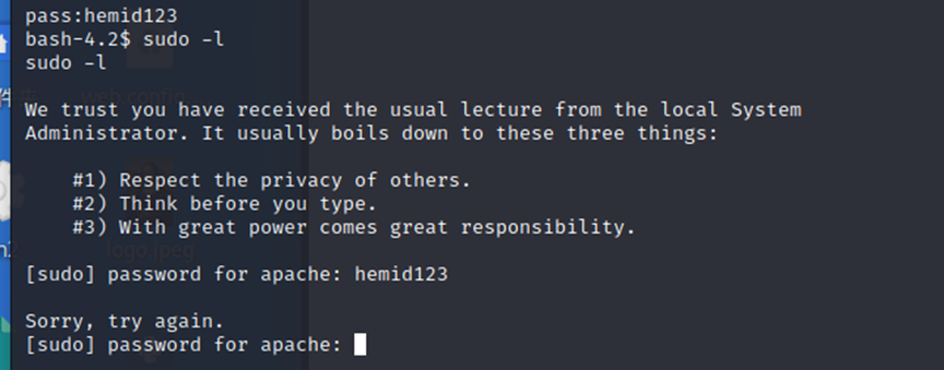 获得flag,以及一个密码我们进行sudo -l,看看是不是apahce用户的密码