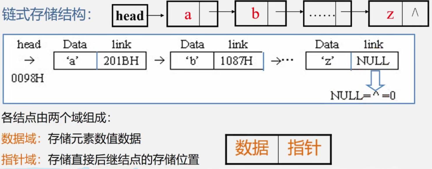 用一组任意的存储单元存储数据元素(可能连续也可能不连续),数据元素之间的逻辑关系用指针来表示(用指针存放后继元素的存储地址)