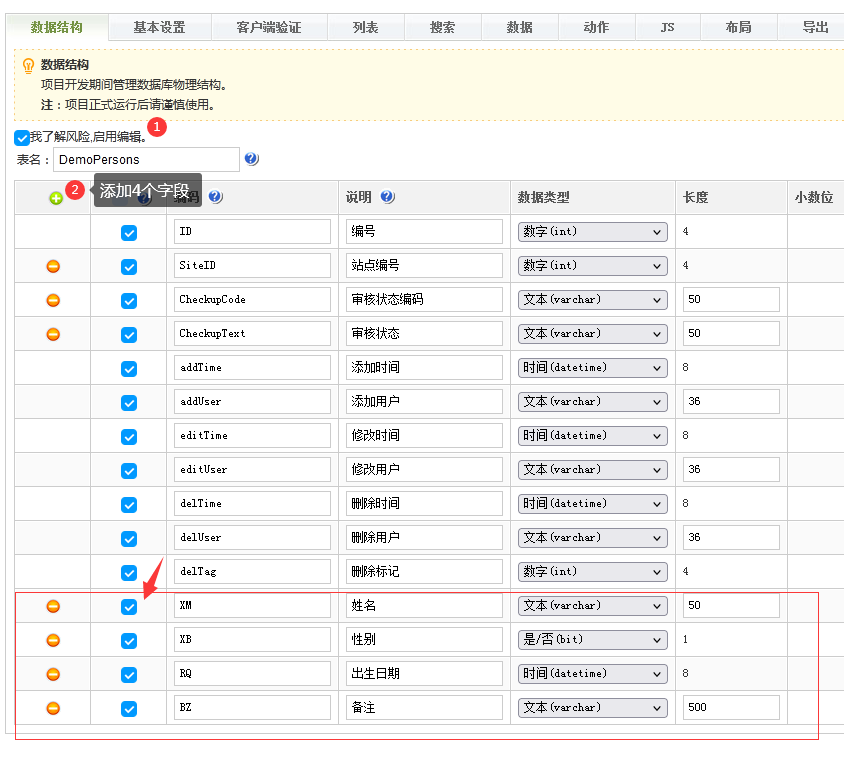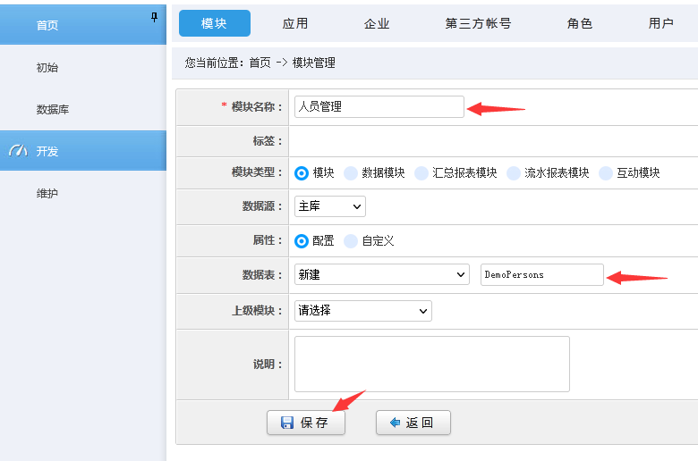 2.登录开发平台,新建一个模块,模块名称为:人员管理,数据表:DemoPersons,也可以在数据库先建好表,这里来选择数据库建好的表名。