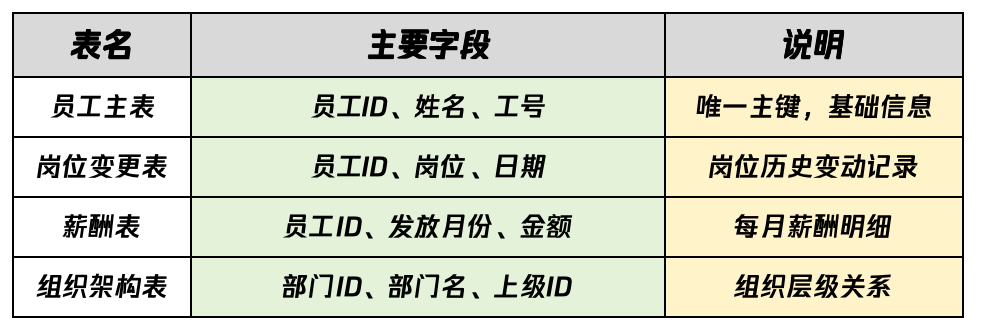在Excel或旧系统导出数据时,常见一张表里既有员工基本信息、岗位变化记录,又有绩效、薪酬等混杂字段。表格字段命名杂乱,甚至存在合并单元格和多级表头。