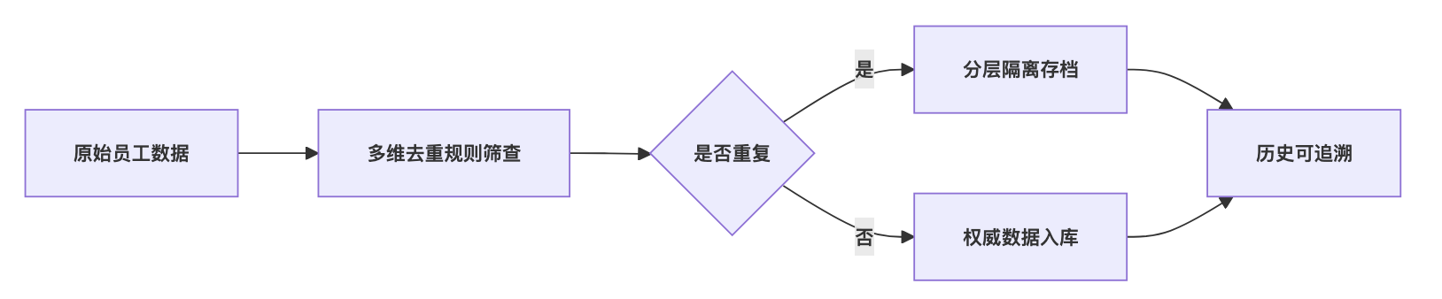 - 多维去重规则:以“姓名+身份证号+入职时间”为复合主键,筛查重复数据。