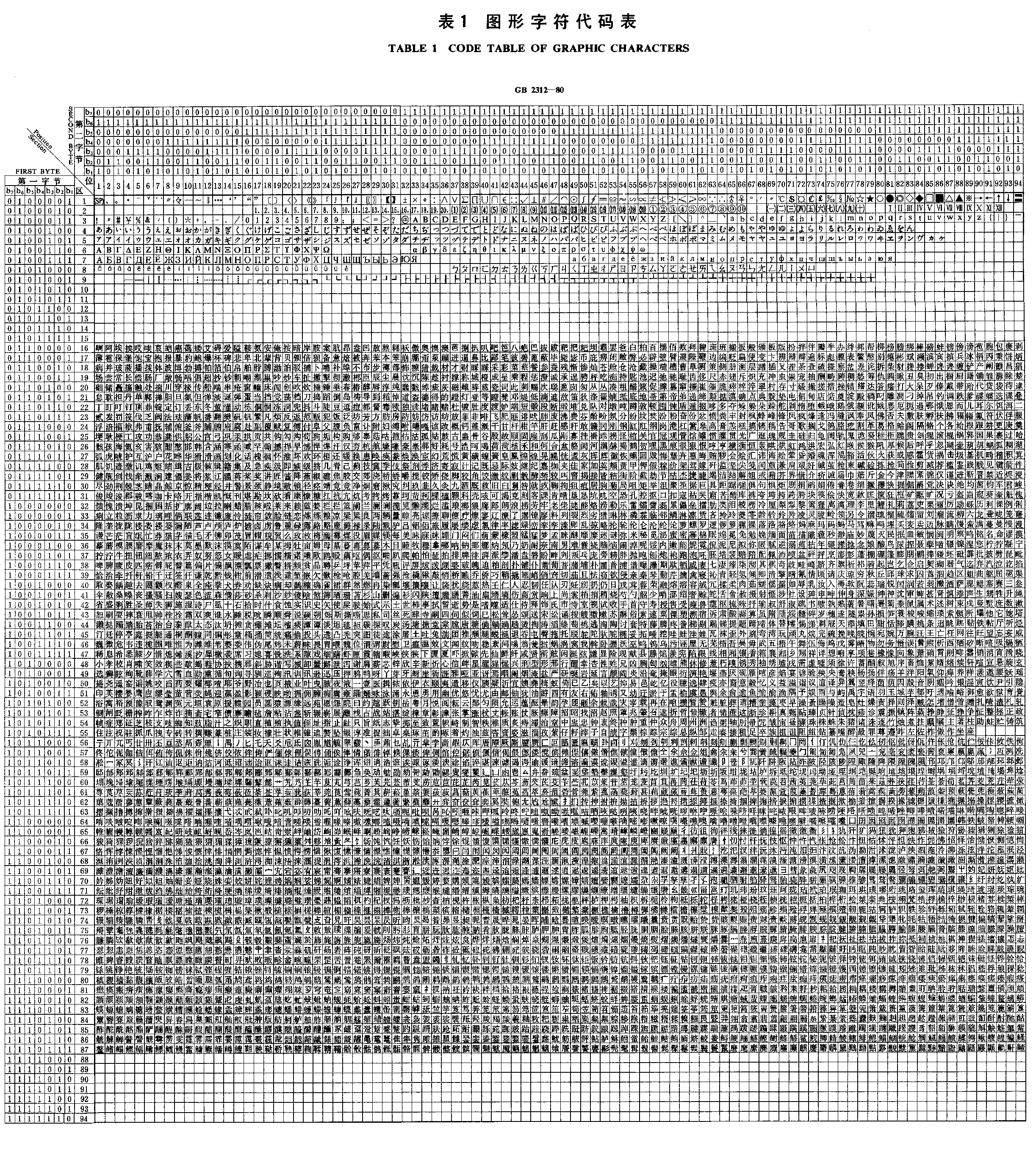 1980年,我国发布了一个国家标准《信息交换用汉字编码字符集-基本集》(标准号GB2312-80)。将常用符号和常用汉字进行了分区编码,大体而言是划成94个 区,每个区有94位,这样就有94*94=有8836个格子可用。标准规定,将区的编号用前一个字节,区内的编码用后一个字节来表示,前后两个字节相连,这样用来表示GB2312-80中所收集的字符,其中大部分汉字都是常用字,因此GB2312影响深远。