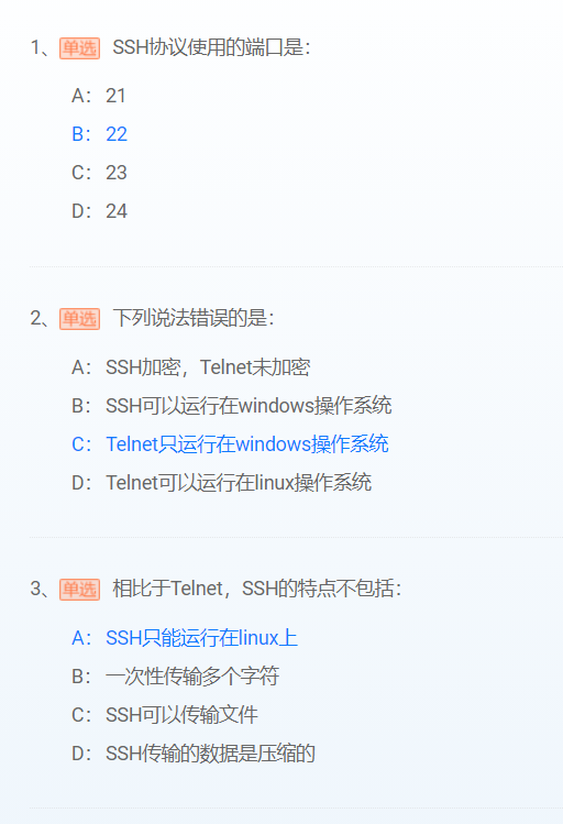 2.telnet的默认端口号为23;ssh的默认端口号为22.