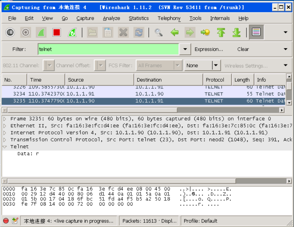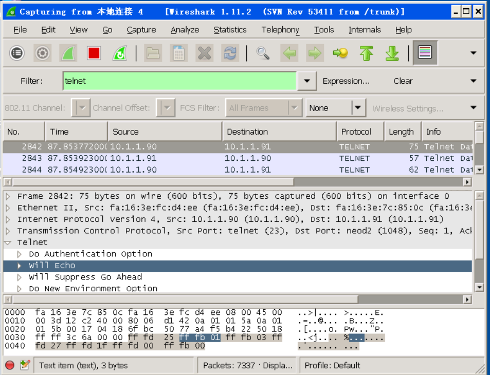 重新连接Telnet,然后在Wireshark中找到包