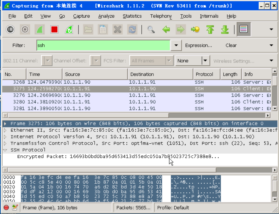 继续打开Wireshark,输入过滤条件ssh。
