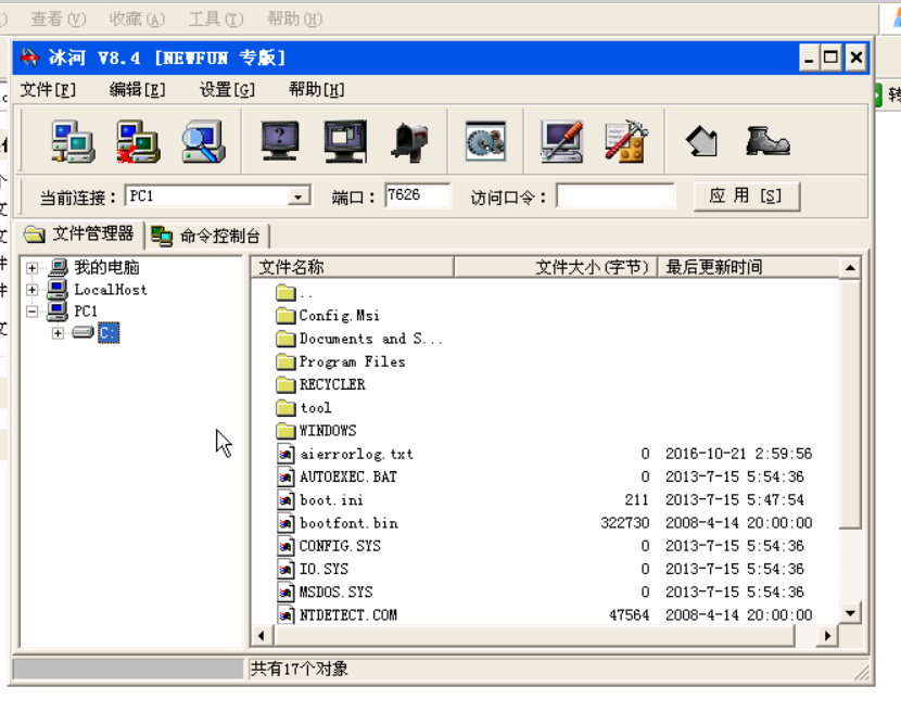 单击添加的主机(PC1)出现如图6添加主机界面,如果连接成功,则会显示服务器端主机上的盘符如图7服务器端主机盘符。这时我们就可以像操作自己的电脑一样操作远程目标电脑.