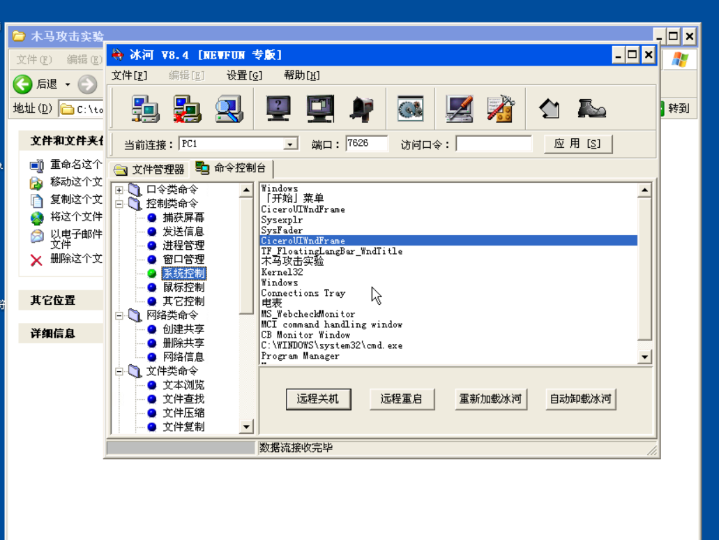 点击“控制类命令”前面的“+”,点击“系统控制”可看到“自动卸载冰河”按钮并点击,在弹出的窗口里面点击“是”,则可以卸载远程主机上的木马如图14自动卸载冰河木马。