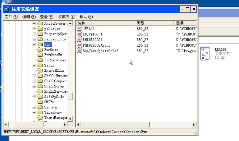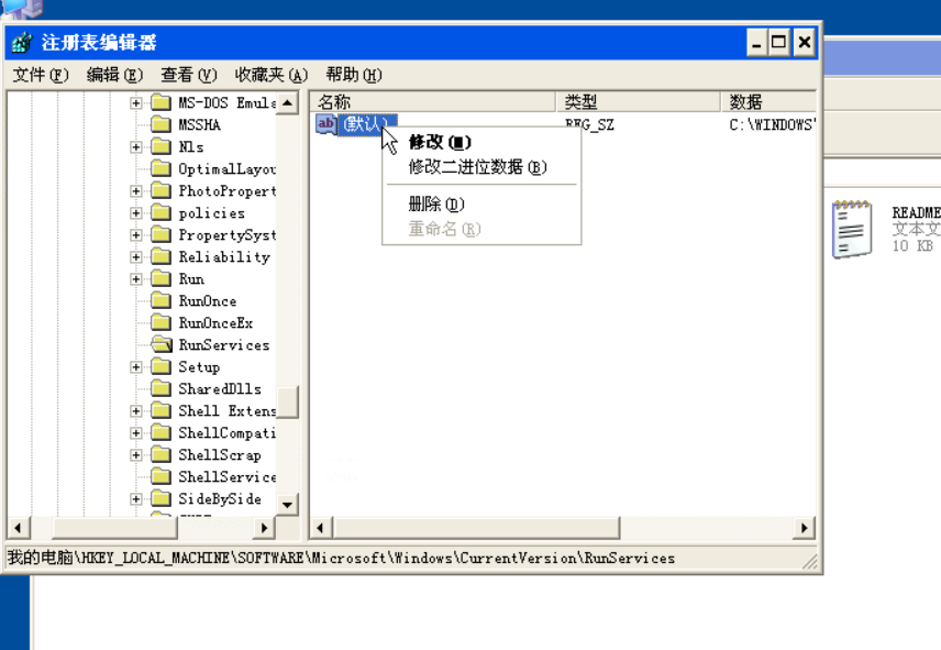 上面两个注册表的子键目录Run和Runservices中存放的键值是系统启动时自动启动的程序,一般病毒程序,木马程序,后门程序等都放在这些子键目录下,所以要经常检查这些子键目录下的程序,如果有不明程序,要着重进行分析。