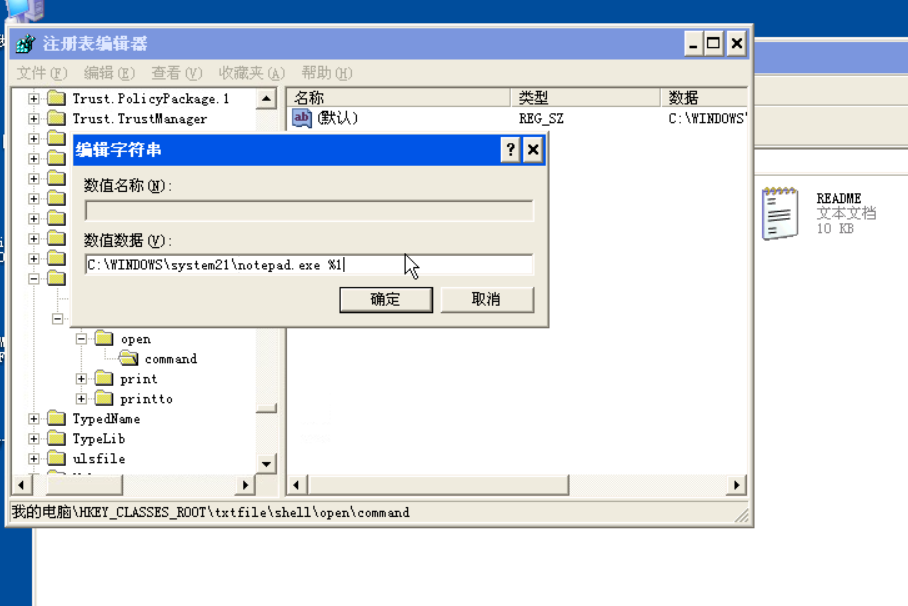 方法是找到注册表的HKEY_CLASSES_ROOT\txtfile\Shell\open\command下的默认值,选中“(默认)”,单击鼠标右键,选择修改如图18编辑字符串。