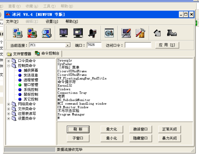 “窗口管理”:这个功能可以使远程主机上的窗口进行刷新,最大化,最小化,激活,隐藏等操作。